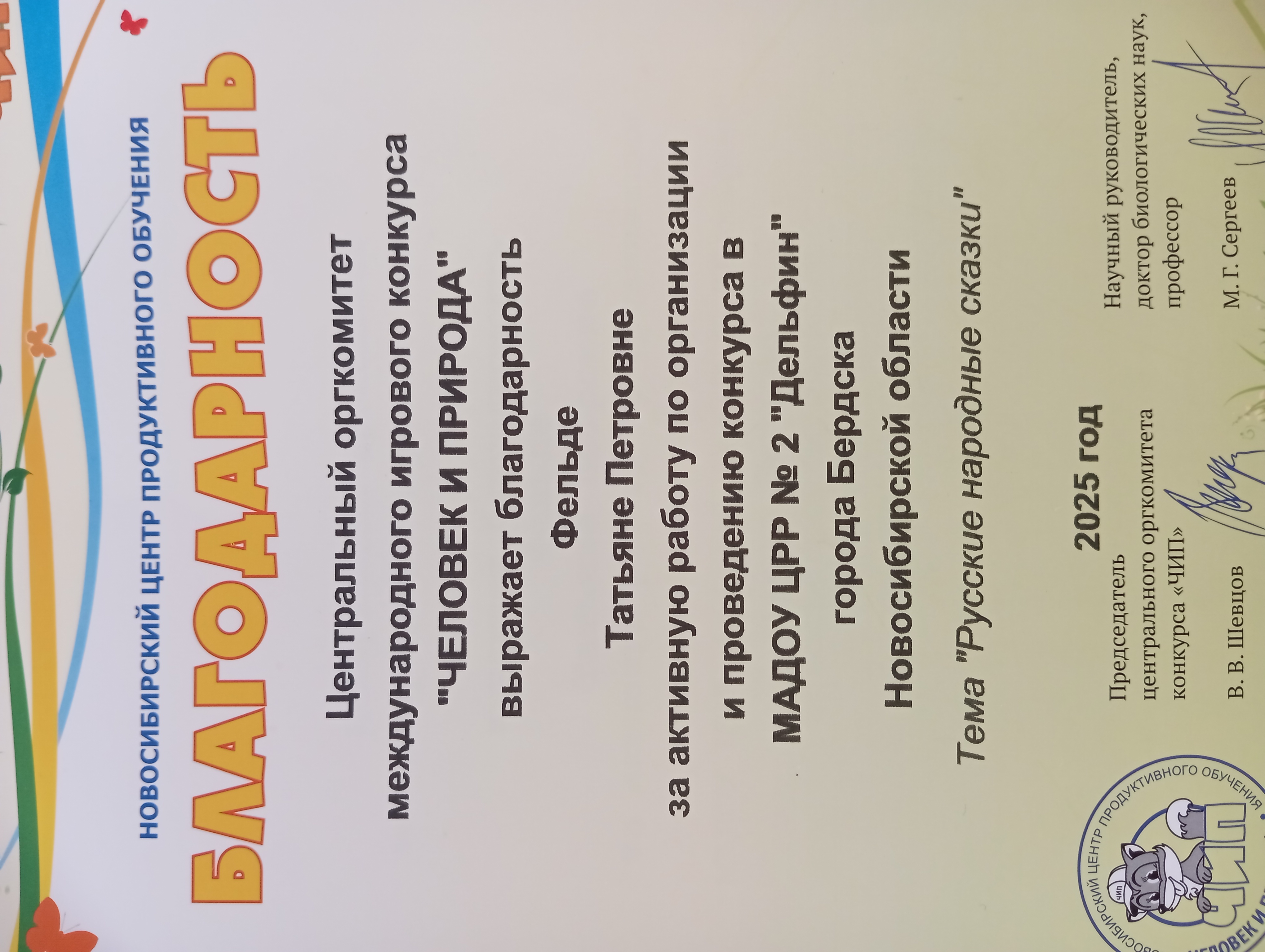 Благодарность за активную работу по организации и проведению международного игрового конкурса "Человек и природа", 2025 г.