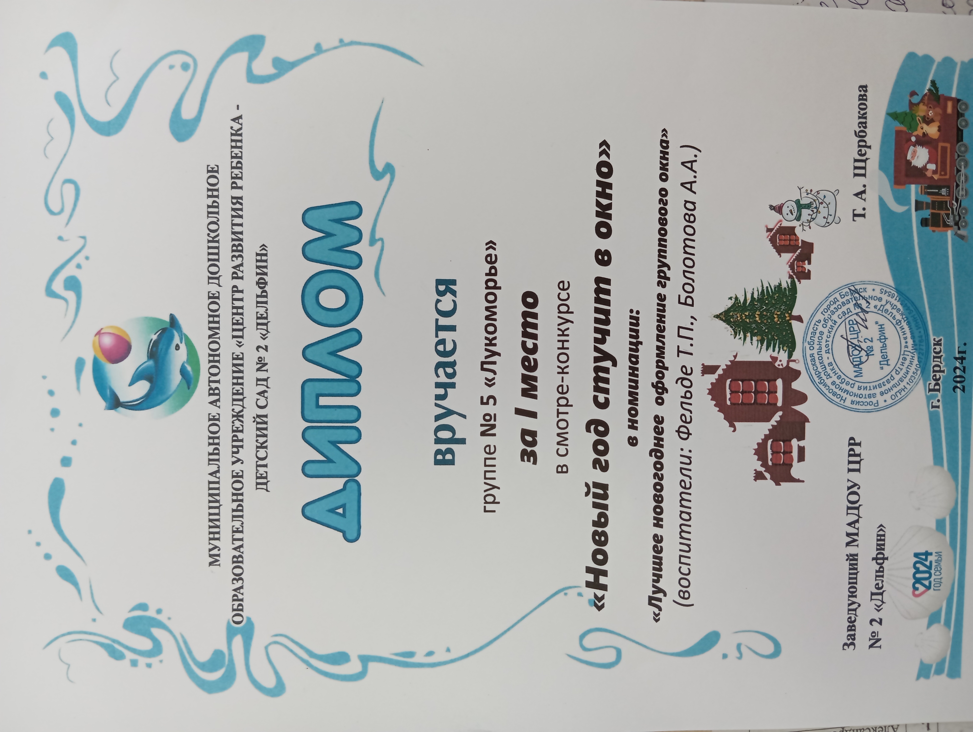 Диплом 1 место в смотре - конкурсе "Новый год стучит в окошко" в номинации "Лучшее новогоднее оформление группового окна", декабрь 2024г.